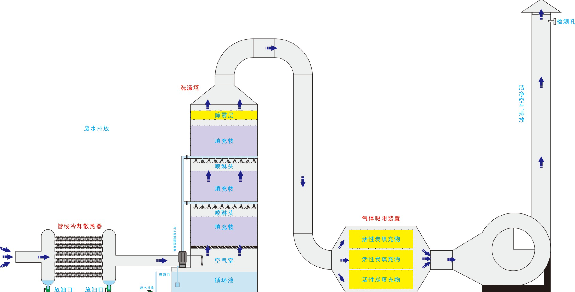 沥青废气由风管引入喷淋塔(净化塔),经过填料层,废气与溶剂、碱液进行气液两相充分接触吸收中和反应,达到脱硫脱硝的目的,废气经过净化后,再经除雾板脱水除雾后由风机吸入其他处理设备。吸收液在塔底经水泵增压后在塔顶喷淋而下,最后回流至塔底循环使用。净化后的废气达到国家排放标准。